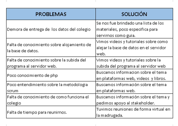 - Manejar tiempos: Debido a tener muchos trabajos de otros cursos hicimos reuniones online y a la poca disponibilidad de los integrantes por motivos laborales tuvimos que pedir permiso a nuestros centros laborales.